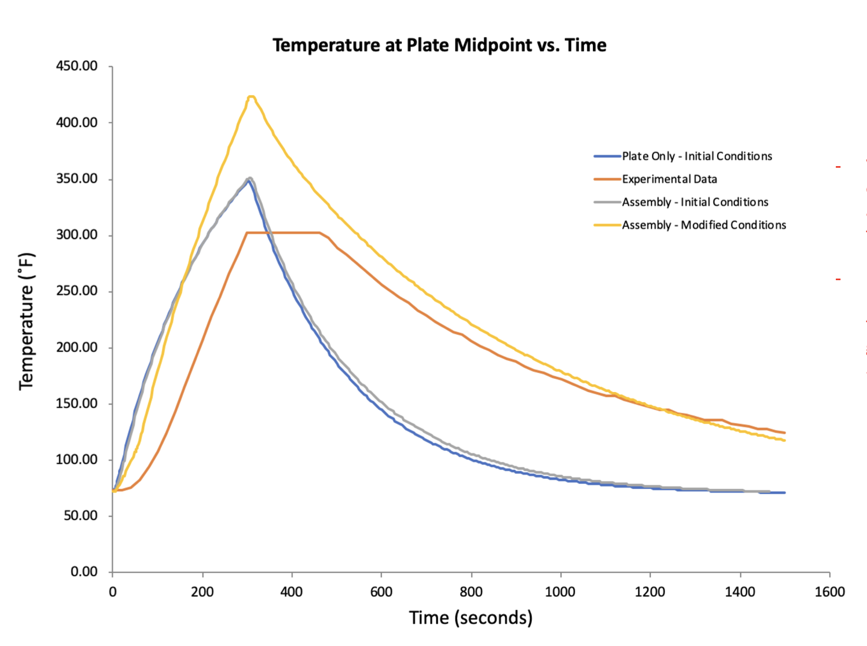 A steady-state thermal load was applied to a PCB board alone and in a stackup, simulating electronic component heating. Stresses were found to be highest at the mounting features. Lower maximum temperature (184˚F vs. 213˚F) was observed when the components were stacked, likely explained by greater outer surface convection and heat dissipation in added directions.