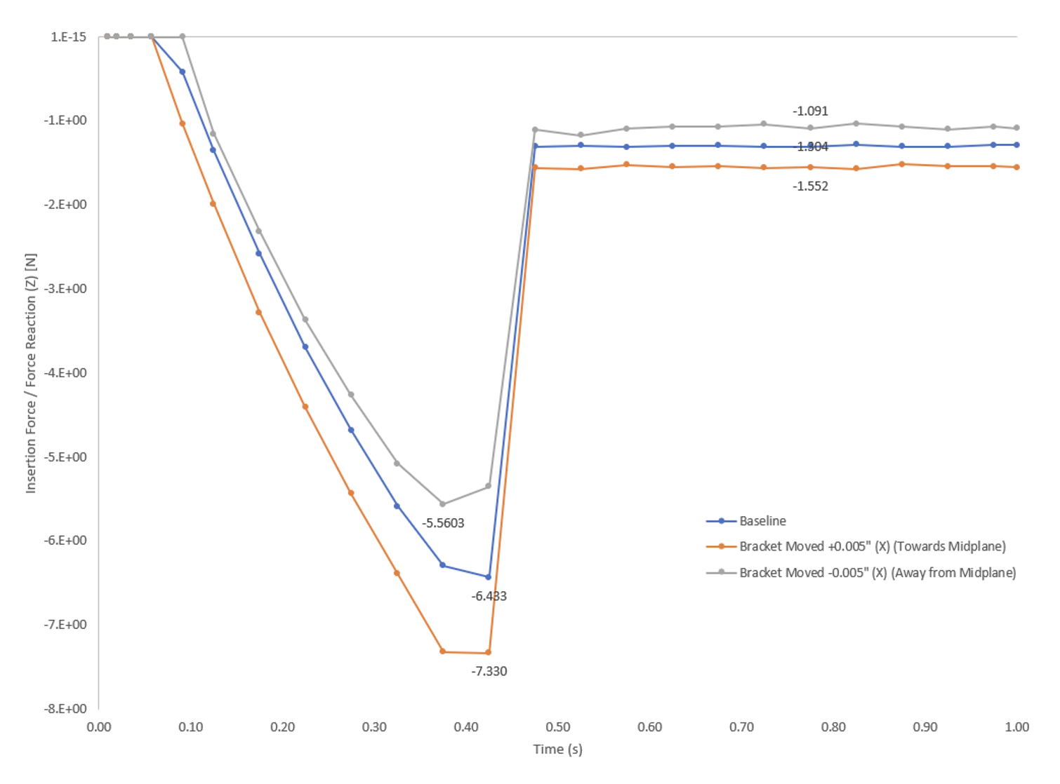Figure 3. Insertion Force vs. Time for Baseline and Tolerance Edge Cases